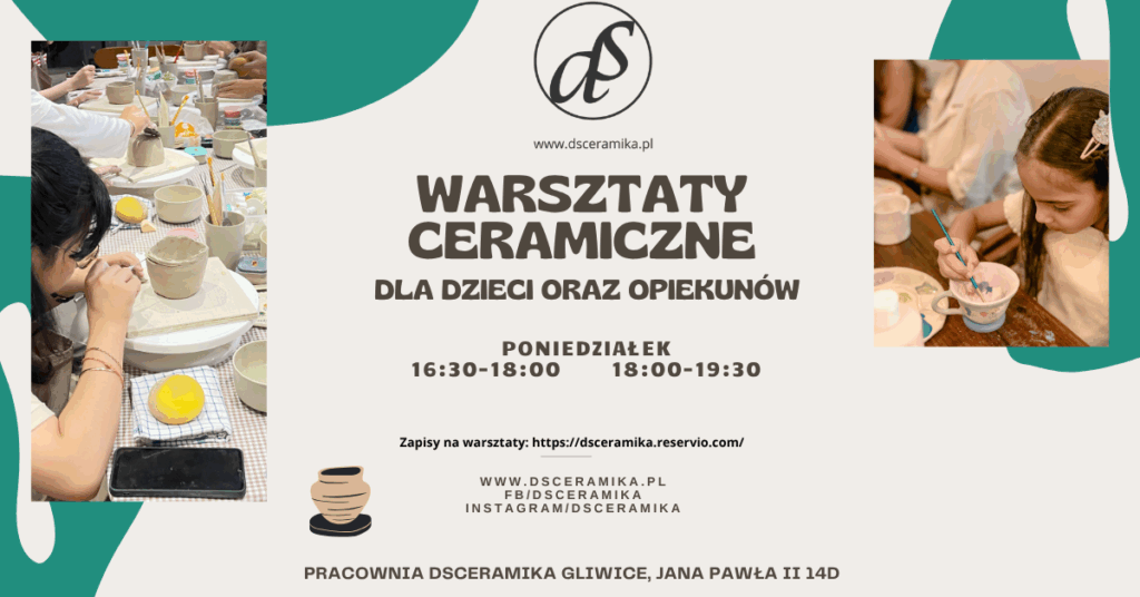 🎨 Warsztaty ceramiczne dla dzieci do 12lat oraz dzieci i opiekunów lat w Pracowni DSceramika! Zapraszamy na rodzinne warsztaty ceramiczne w DSCERAMIKA w Gliwicach – miejsce, gdzie dzieci i dorośli odkrywają magię pracy z gliną. Wspólne lepienie to chwila relaksu, kreatywności i bliskości, a własnoręcznie stworzone prace staną się piękną pamiątką rodzinnego czasu. Nasze spotkania pozwolą przejść przez cały proces powstawania ceramiki – od gliny po gotowy przedmiot. Dlatego potrzebne są minimum dwa spotkania:➡️ na pierwszym lepimy,➡️ na kolejnym – po 2-4 tygodniach – szkliwimy, by nadać pracom kolorów i blasku. Nasze warsztaty ceramiczne to doskonała okazja do rozwijania wyobraźni, zdolności manualnych oraz poznania podstaw pracy z ceramiką – wszystko w atmosferze swobody i dobrej zabawy. 📅 Terminy: poniedziałek godz. 16:30-18:00 oraz 18:00-19:30 warunkiem odbycia się warsztatów jest zebranie się minimalnej grupy (4 osób) 📍 Miejsce:Pracownia DSceramika, ul. Jana Pawła II 14d, Gliwice – tu, gdzie kreatywność spotyka się z relaksem! 👧🧒 Dla kogo:Dla dzieci do12 lat oraz młodszych dzieci lepiących z opiekunem. Po uzgodnieniu z Instruktorem istnieje możliwość, aby Rodzic lub Opiekun również lepił własną pracę – wtedy pobierana jest osobna opłata za zajęcia od dziecka i rodzica/opiekuna. 🕓 Czas trwania: 1,5 godziny 💰 Koszt zajęć (obowiązuje tylko na zajęciach w poniedziałki): 110 zł – opiekun z dzieckiem (do 12 lat) pracujący nad wspólną pracą60 zł – pojedyncze wejście dziecka lub dodatkowe dziecko 200 zł – Karnet dla dziecka na 4 spotkania po 1,5 godziny 📅 Warsztaty odbywają się w poniedziałki:👉 16:30–18:00 lub 18:00–19:30 🔗 Aktualny grafik warsztatów ceramicznych znajdziesz [TUTAJ].Przy zapisie jednego rodzica z dzieckiem prosimy o dokonanie dwóch zapisów (dla każdego uczestnika). Nie trzeba mieć żadnego doświadczenia – wystarczy ciekawość i chęć tworzenia! 🔧 W programie: lepienie z gliny różnych form użytkowych i dekoracyjnych, poznawanie technik ceramicznych i pracy z narzędziami, malowanie i szkliwienie własnych dzieł, wspierająca i kameralna atmosfera pracy twórczej. 🎁 Co zabrać:Tylko dobry humor! Wszystkie materiały, narzędzia i fartuszki zapewniamy na miejscu. W cenie: ok 1 kg gliny, wszystkie materiały, wypał prac oraz opieka instruktora. 📩 Zapisy: obowiązują zapisy przez nasz kalendarz Liczba miejsc ograniczona – obowiązują zapisy! 🌿 Dlaczego warto pozwolić dzieciom pracować z gliną? Praca z gliną to coś więcej niż tylko zabawa – to pełnowartościowe doświadczenie rozwojowe, które wspiera dzieci na wielu poziomach: 👐 Rozwija motorykę małąLepienie, ugniatanie i modelowanie gliny doskonale ćwiczy mięśnie dłoni i palców. To nie tylko przygotowanie do nauki pisania, ale także sposób na rozwój precyzji i koordynacji ruchowej. 🧠 Pobudza kreatywność i wyobraźnięZ kawałka gliny może powstać wszystko, co tylko dziecko sobie wymarzy! To zachęca do twórczego myślenia, podejmowania decyzji i wyrażania siebie w unikalny sposób. 🧘♀️ Uczy cierpliwości i koncentracjiProces tworzenia ceramiki – od pomysłu po gotowy wypał – wymaga skupienia i czasu. Dzieci uczą się, że warto być cierpliwym i że efekty pracy przychodzą etapami. 😊 Wzmacnia poczucie sprawczości i pewność siebieStworzenie czegoś od podstaw daje ogromną satysfakcję. Dzieci czują dumę z własnych prac, a to przekłada się na lepszą samoocenę. 🌈 Wspiera rozwój emocjonalnyPraca z gliną działa wyciszająco, pomaga rozładować napięcia i emocje. To idealne zajęcie dla dzieci, które potrzebują chwili spokoju i przestrzeni na wyrażenie siebie bez słów. 👫 Buduje relacje społeczneWspólne warsztaty to okazja do poznania rówieśników, współpracy, wymiany pomysłów i dzielenia się twórczą radością w kameralnej, przyjaznej atmosferze. Warsztaty prowadzi Róża – nasza nowa animatorka i instruktorka zajęć dla dzieci! To młoda, pełna pozytywnej energii osoba, która uwielbia pracę z najmłodszymi i potrafi stworzyć ciepłą, twórczą atmosferę. Z cierpliwością i uśmiechem wprowadzi dzieci w fascynujący świat ceramiki, ucząc ich podstawowych technik lepienia i pomagając rozwijać wyobraźnię. 🧡 W Pracowni DSceramika wierzymy, że kontakt z gliną rozwija nie tylko umiejętności manualne, ale też serce i duszę.Zapraszamy wszystkie dzieci do odkrywania swojej twórczości w bezpiecznej, inspirującej przestrzeni!