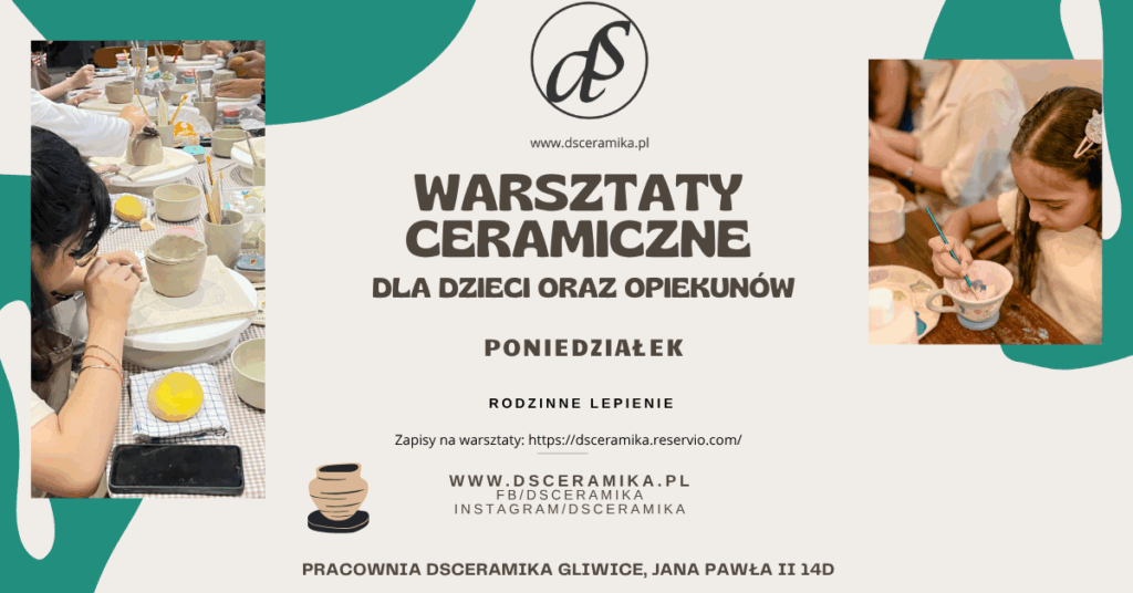 🎨 Warsztaty ceramiczne dla dzieci do 12lat oraz dzieci i opiekunów lat w Pracowni DSceramika! Zapraszamy na rodzinne warsztaty ceramiczne w DSCERAMIKA w Gliwicach – miejsce, gdzie dzieci i dorośli odkrywają magię pracy z gliną. Wspólne lepienie to chwila relaksu, kreatywności i bliskości, a własnoręcznie stworzone prace staną się piękną pamiątką rodzinnego czasu. Nasze spotkania pozwolą przejść przez cały proces powstawania ceramiki – od gliny po gotowy przedmiot. Dlatego potrzebne są minimum dwa spotkania:➡️ na pierwszym lepimy,➡️ na kolejnym – po 2-4 tygodniach – szkliwimy, by nadać pracom kolorów i blasku. Nasze warsztaty ceramiczne to doskonała okazja do rozwijania wyobraźni, zdolności manualnych oraz poznania podstaw pracy z ceramiką – wszystko w atmosferze swobody i dobrej zabawy 📍 Miejsce:Pracownia DSceramika, ul. Jana Pawła II 14d, Gliwice – tu, gdzie kreatywność spotyka się z relaksem! 👧🧒 Dla kogo:Dla dzieci do12 lat oraz młodszych dzieci lepiących z opiekunem. Po uzgodnieniu z Instruktorem istnieje możliwość, aby Rodzic lub Opiekun również lepił własną pracę – wtedy pobierana jest osobna opłata za zajęcia od dziecka i rodzica/opiekuna. 🕓 Czas trwania: 1,5 godziny 💰 Koszt zajęć (obowiązuje tylko na zajęciach w poniedziałki): 60 zł – pojedyncze wejście 1 dziecka lub dodatkowe dziecko (pracujące samodzielnie) 110 zł – opiekun z dzieckiem (do 7 lat) pracujący nad 1 wspólnym projektem 110 zł – opiekun pracujący samodzielnie nad własnym projektem 200 zł – Karnet dla dziecka na 4 spotkania po 1,5 godziny, ważny 1 miesiąc 📅 Warsztaty odbywają się w poniedziałki warunkiem odbycia się warsztatów jest zebranie się minimalnej grupy (4 osób) Liczba miejsc ograniczona – obowiązują zapisy! 🔗 Aktualny grafik warsztatów ceramicznych znajdziesz [TUTAJ].Przy zapisie jednego rodzica z dzieckiem prosimy o dokonanie dwóch zapisów (dla każdego uczestnika). Nie trzeba mieć żadnego doświadczenia – wystarczy ciekawość i chęć tworzenia! 🔧 W programie: lepienie z gliny różnych form użytkowych i dekoracyjnych, poznawanie technik ceramicznych i pracy z narzędziami, malowanie i szkliwienie własnych dzieł, wspierająca i kameralna atmosfera pracy twórczej. 🎁 Co zabrać:Tylko dobry humor! Wszystkie materiały, narzędzia i fartuszki zapewniamy na miejscu. W cenie: ok 1 kg gliny, wszystkie materiały, wypał prac oraz opieka instruktora. 📩 Zapisy: obowiązują zapisy przez nasz kalendarz 🌿 Dlaczego warto pozwolić dzieciom pracować z gliną? Praca z gliną to coś więcej niż tylko zabawa – to pełnowartościowe doświadczenie rozwojowe, które wspiera dzieci na wielu poziomach: 👐 Rozwija motorykę małąLepienie, ugniatanie i modelowanie gliny doskonale ćwiczy mięśnie dłoni i palców. To nie tylko przygotowanie do nauki pisania, ale także sposób na rozwój precyzji i koordynacji ruchowej. 🧠 Pobudza kreatywność i wyobraźnięZ kawałka gliny może powstać wszystko, co tylko dziecko sobie wymarzy! To zachęca do twórczego myślenia, podejmowania decyzji i wyrażania siebie w unikalny sposób. 🧘♀️ Uczy cierpliwości i koncentracjiProces tworzenia ceramiki – od pomysłu po gotowy wypał – wymaga skupienia i czasu. Dzieci uczą się, że warto być cierpliwym i że efekty pracy przychodzą etapami. 😊 Wzmacnia poczucie sprawczości i pewność siebieStworzenie czegoś od podstaw daje ogromną satysfakcję. Dzieci czują dumę z własnych prac, a to przekłada się na lepszą samoocenę. 🌈 Wspiera rozwój emocjonalnyPraca z gliną działa wyciszająco, pomaga rozładować napięcia i emocje. To idealne zajęcie dla dzieci, które potrzebują chwili spokoju i przestrzeni na wyrażenie siebie bez słów. 👫 Buduje relacje społeczneWspólne warsztaty to okazja do poznania rówieśników, współpracy, wymiany pomysłów i dzielenia się twórczą radością w kameralnej, przyjaznej atmosferze. Warsztaty prowadzi Róża – nasza nowa animatorka i instruktorka zajęć dla dzieci! To młoda, pełna pozytywnej energii osoba, która uwielbia pracę z najmłodszymi i potrafi stworzyć ciepłą, twórczą atmosferę. Z cierpliwością i uśmiechem wprowadzi dzieci w fascynujący świat ceramiki, ucząc ich podstawowych technik lepienia i pomagając rozwijać wyobraźnię. 🧡 W Pracowni DSceramika wierzymy, że kontakt z gliną rozwija nie tylko umiejętności manualne, ale też serce i duszę.Zapraszamy wszystkie dzieci do odkrywania swojej twórczości w bezpiecznej, inspirującej przestrzeni!
