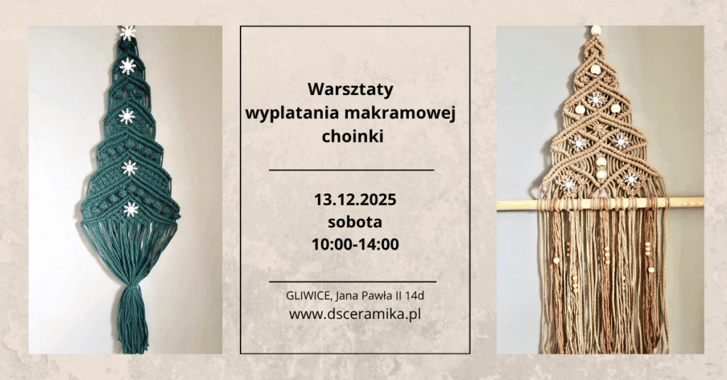 🌲 Świąteczne Warsztaty Makramy – stwórz własną makramową choinkę 13 grudnia 2025 (sobota) | godz. 10:00–14:00DSCERAMIKA – Gliwice Zanurz się w magiczny klimat grudnia i podaruj sobie chwilę twórczego oddechu. Na naszych świątecznych warsztatach makramy stworzysz wyjątkową makramową choinkę, która wprowadzi do Twojego domu ciepło, naturalność i atmosferę handmade pełną serca. Wyplatanie makramy to coś więcej niż technika – to spokojny rytuał, który pomaga zwolnić, skupić się na drobnych gestach i odnaleźć radość tworzenia. Pod okiem instruktorki, krok po kroku nauczysz się wiązać węzły, komponować ozdobne detale i budować swoją dekorację tak, aby była piękna, harmonijna i odzwierciedlała Twój styl. Dlaczego warto wziąć udział? ✨ stworzysz niepowtarzalną dekorację świąteczną z makramy✨ poznasz techniki wyplatania i tajniki makramy w stylu boho✨ spędzisz twórczy, spokojny poranek w inspirującej atmosferze✨ wykonasz prezent, który ma duszę – ręcznie robioną choinkę makramową✨ oderwiesz się od codziennego pędu i zanurzysz w kreatywnym flow Nie potrzebujesz doświadczenia – warsztaty makramowe dla początkujących są w pełni prowadzone krok po kroku, a wszystkie materiały zapewnia pracownia DSCERAMIKA. To idealna okazja, by przygotować coś wyjątkowego na święta: naturalną ozdobę, unikatowy prezent lub dekorację w stylu boho, która doda wnętrzu świątecznej magii. Liczba miejsc jest ograniczona – zarezerwuj swoją przestrzeń twórczą już teraz.Odkryj przyjemność wyplatania i pozwól, aby makrama stała się Twoim grudniowym rytuałem. Kliknij tutaj, aby zarezerwować miejsce w sklepie » Prosimy o zapoznanie się z treścią Regulaminu Warsztatów na stronie Organizatora/regulamin-warsztatow/